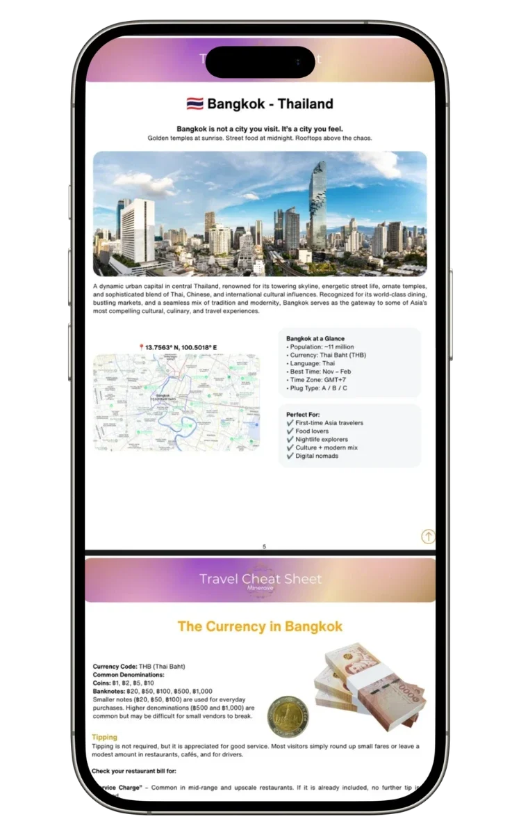 The Bangkok Cheat Sheet is a digital, interactive travel guide designed to help you explore Bangkok efficiently. It includes maps, local tips, shortcuts, and money-saving advice - all in one place.