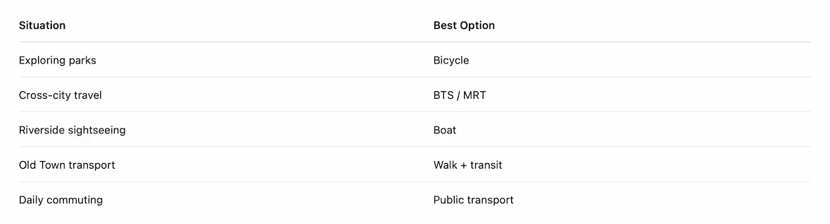 - A way to experience parks, riversides, and local neighborhoods. It is not a replacement for BTS, MRT, taxis, or boats.
